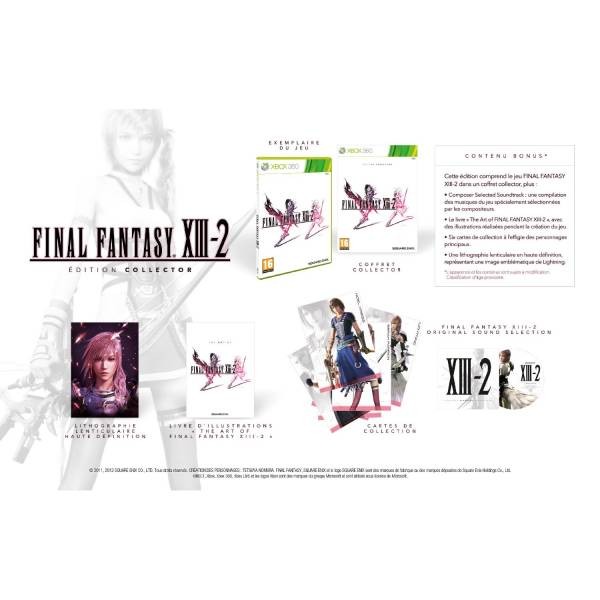 Contient le jeu Final Fantasy XIII-2 dans un coffret collector + Composer Selected Soundtrack + Le livre The Art of Final Fantasy XIII-2 + Six cartes de collection + Une lithographie lenticulaire HD